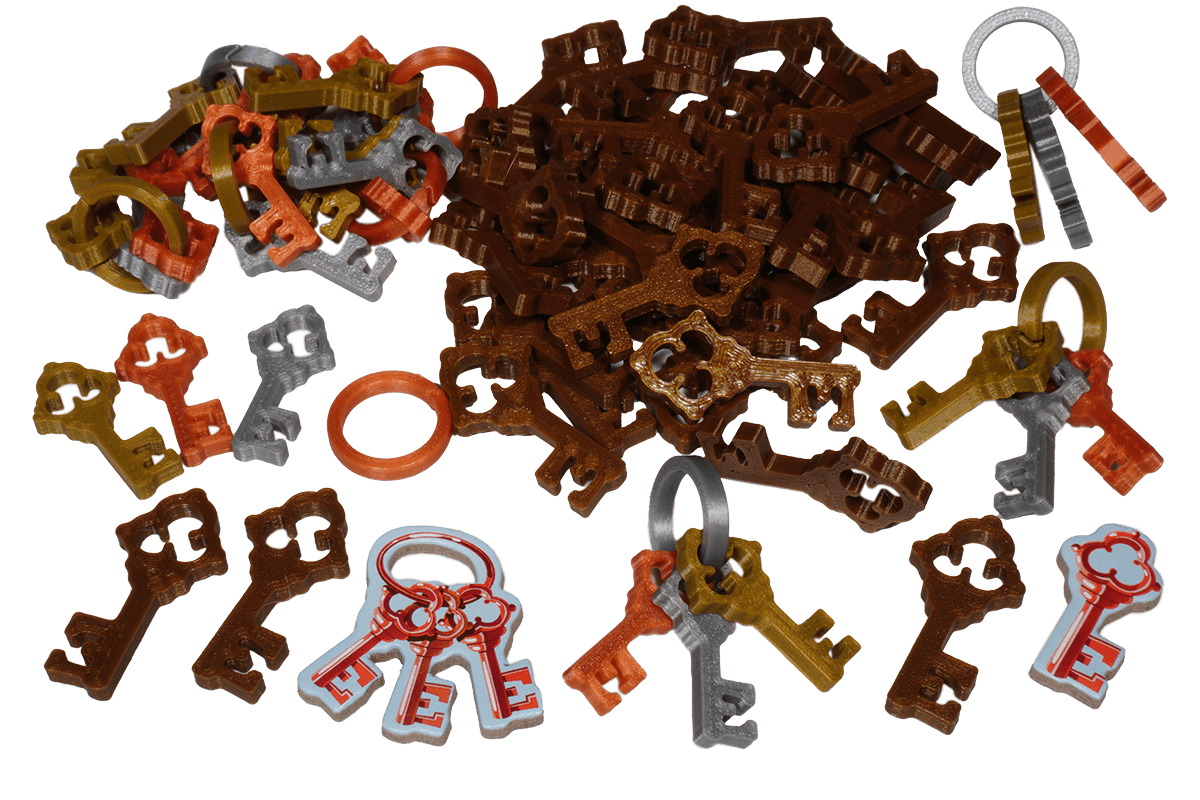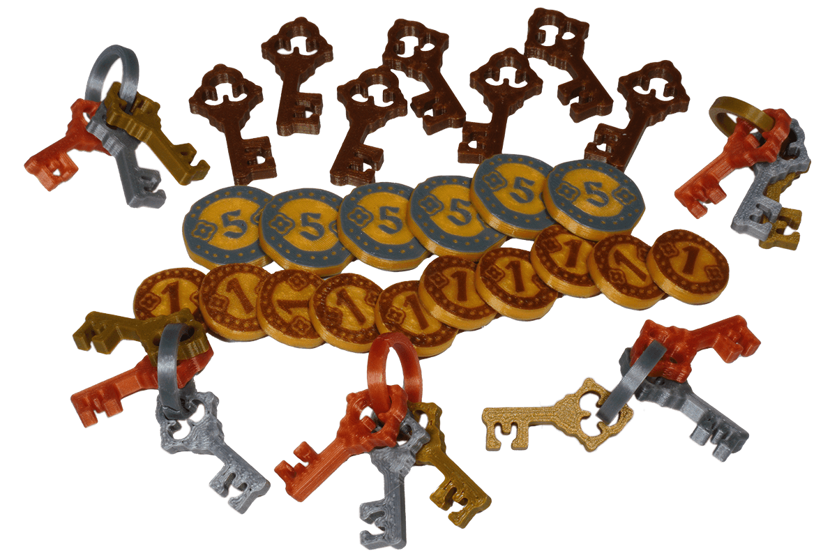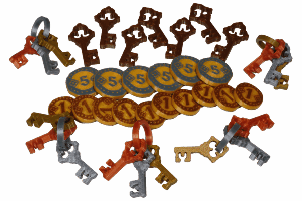 Ein großer Einzelschlüssel trifft auf einen Schlüsselring mit drei farblich unterschiedlichen Schlüsseln, ergänzt durch Schlüsselringe in drei Farben. Alles ist klar unterscheidbar und sofort einsatzbereit. Gerade im schnellen, taktischen Spielverlauf helfen die griffigen Formen und das leichte Klappern dabei, Ressourcen intuitiv zu verwalten. So bleibt der Fokus dort, wo er hingehört: auf cleveren Kombos, geschickter Platzierung und dem Aufbau eines Hofstaats, der am Ende die meisten Punkte einfährt.