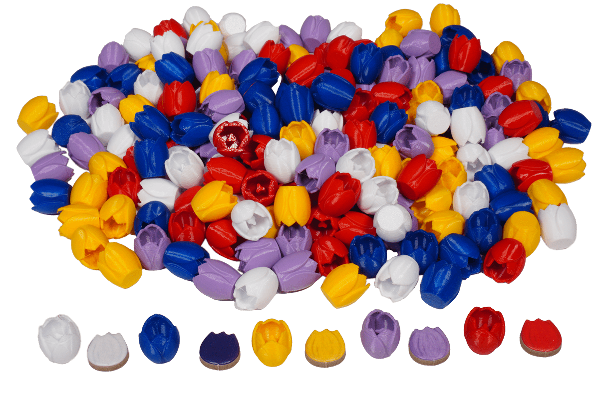 Diese Tulpen ersetzen die kleinen, flachen Pappmarker durch eine große Anzahl farbenprächtiger 3D-Tulpen. Die Tulpen passen ideal auf die Spielertableaus, lassen sich gut greifen und bringen Struktur ins Spiel. Die Farben fügen sich harmonisch ins Spiel ein und machen aus der Verwaltung von Tulpenzwiebeln ein echtes Aufbaugefühl – ganz im Sinne der Blumenstraße, wo Felder voller Blüten einst Reichtum, Risiko und Begehrlichkeiten weckten.