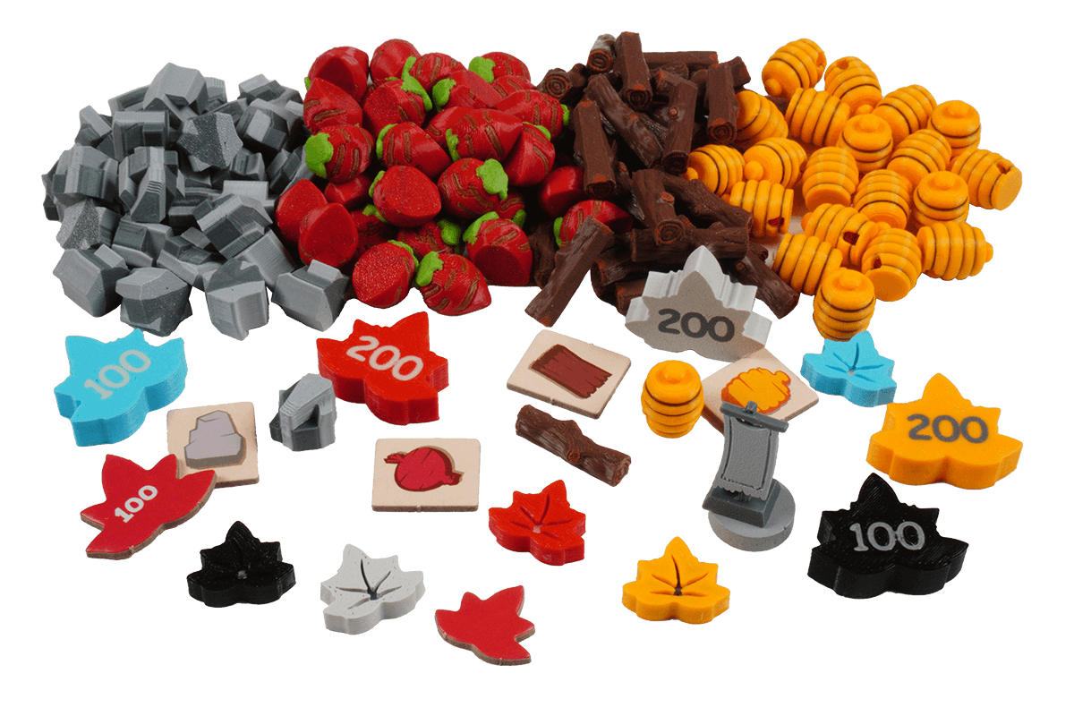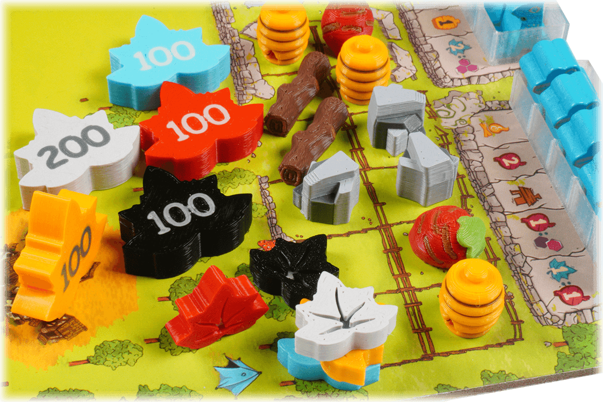 Dieses Set vereint alles, was du für Übersicht und Spielfluss brauchst: detailreiche 3D-Ressourcen wie Bienenstock, Stein, Holz und Nahrung, präzise abgestimmte Spielermarker sowie die markante Fahne für deinen Fortschritt.