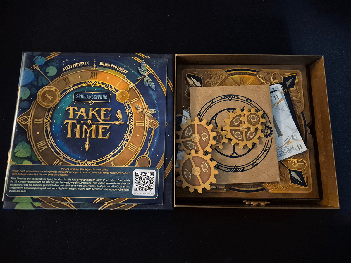 “Take Time ist ein kooperatives Spiel, bei dem ihr die Rätsel verschiedener Uhren lösen müsst. Dazu spielt ihr 12 Karten verdeckt um die Uhr herum. Ihr wisst, wie die Karten am Ende verteilt sein müssen, aber ihr wisst nicht, was die anderen gespielt haben und dürft euch nicht unterhalten. Einfach zu erlernende Regeln und schneller Spielaufbau. Die Spielmechanik entwickelt sich weiter.