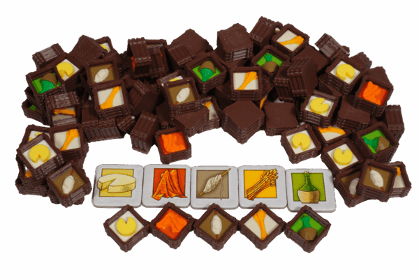 Diese 3D-Waren für Orléans ersetzen die flachen Warenplättchen durch funktionale Kisten mit echtem Spielwert. Insgesamt kommen 90 Waren ins Spiel: Getreide, Käse, Wein, Wolle und Brokat. Jede Ware liegt vertieft in einer kleinen Holzkiste, die sich sowohl offen auf den Warenfeldern als auch umgedreht verdeckt auf dem Reiseplan nutzen lässt.