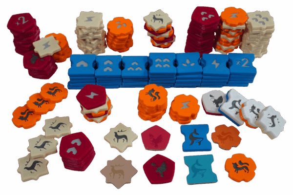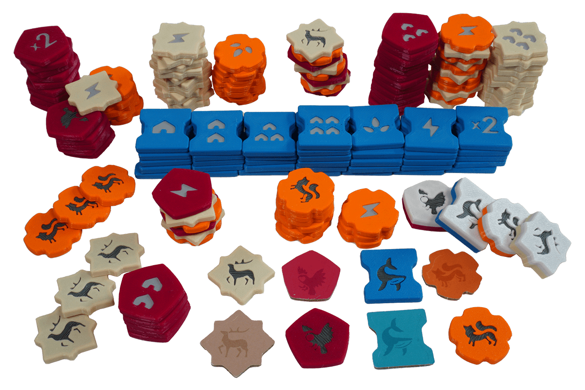 Diese 3D-Token für Rebirth lassen die flachen Pappplättchen hinter sich und bringen ein tollen Gefühl auf den Spieltisch. Alle 144 Clan-Plättchen werden durch griffige Token ersetzt, die sich gut anfühlen und das Spielgeschehen sichtbar machen. Auf der einen Seite prangt das Clansymbol, auf der anderen das passende Aktionsfeld. Dazu kommen vier Wertungsmarker, deren bewusst weiß gehaltene Seite sofort ins Auge fällt.