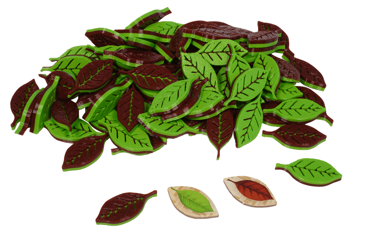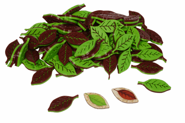 Jedes Teeblatt ist ein einzelner, zweiseitiger Token. Auf der einen Seite zeigt er frischen Tee. Die Token liegen flach in den Teeschalen auf den Spielerboards und lassen sich sauber stapeln. So wächst deine Ernte sichtbar, während du jederzeit erkennst, wie viel frischer Tee gerade in deinen Plantagen liegt.